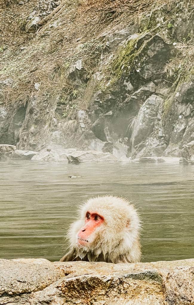 It’s a short walk from where the bus stops up to the hot springs where the macaques like to hang out, playing and swimming in the water whatever the weather.